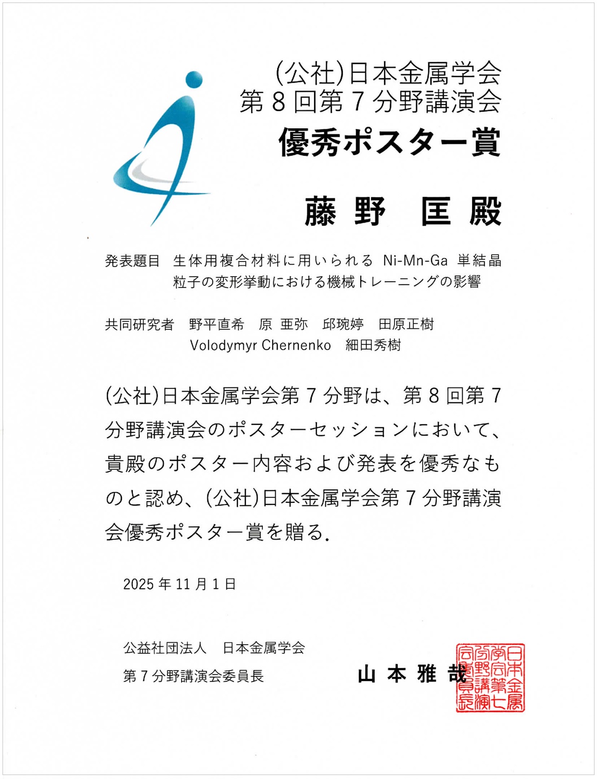 日本金属学会第8回第7分野講演会「優秀ポスター賞 」を受賞(細田・田原研究室 藤野 匡さん)