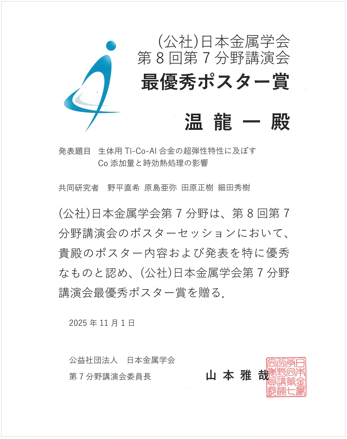 日本金属学会第8回第7分野講演会「最優秀ポスター賞 」を受賞(細田・田原研究室 温龍一さん)
