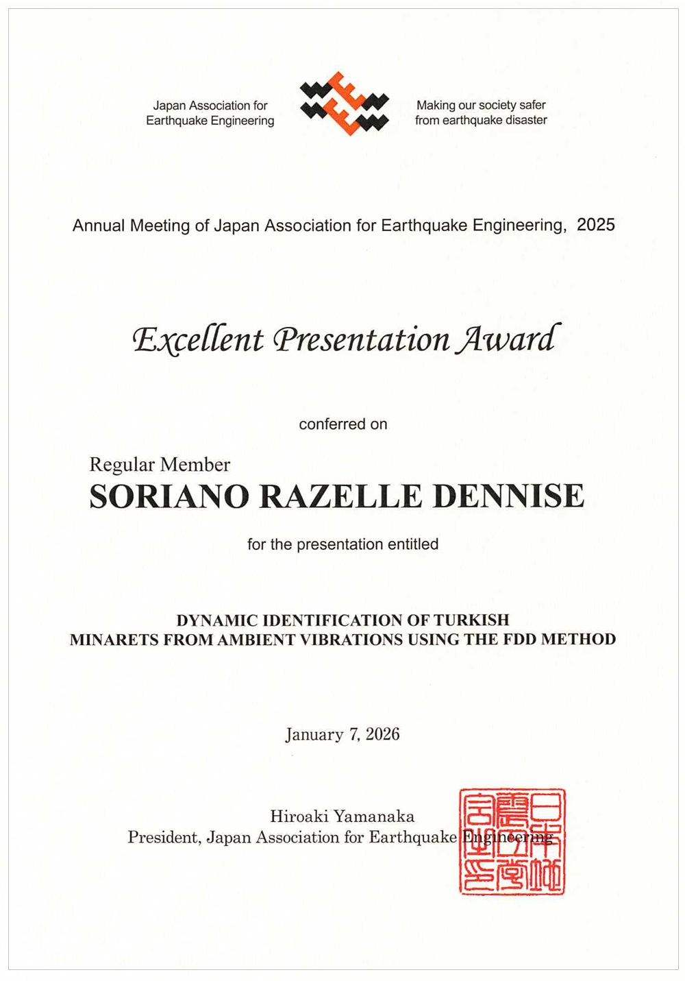 2025年度日本地震工学会大会優秀発表賞を受賞(佐藤研究室 Razelle Dennise A. SORIANOさん)