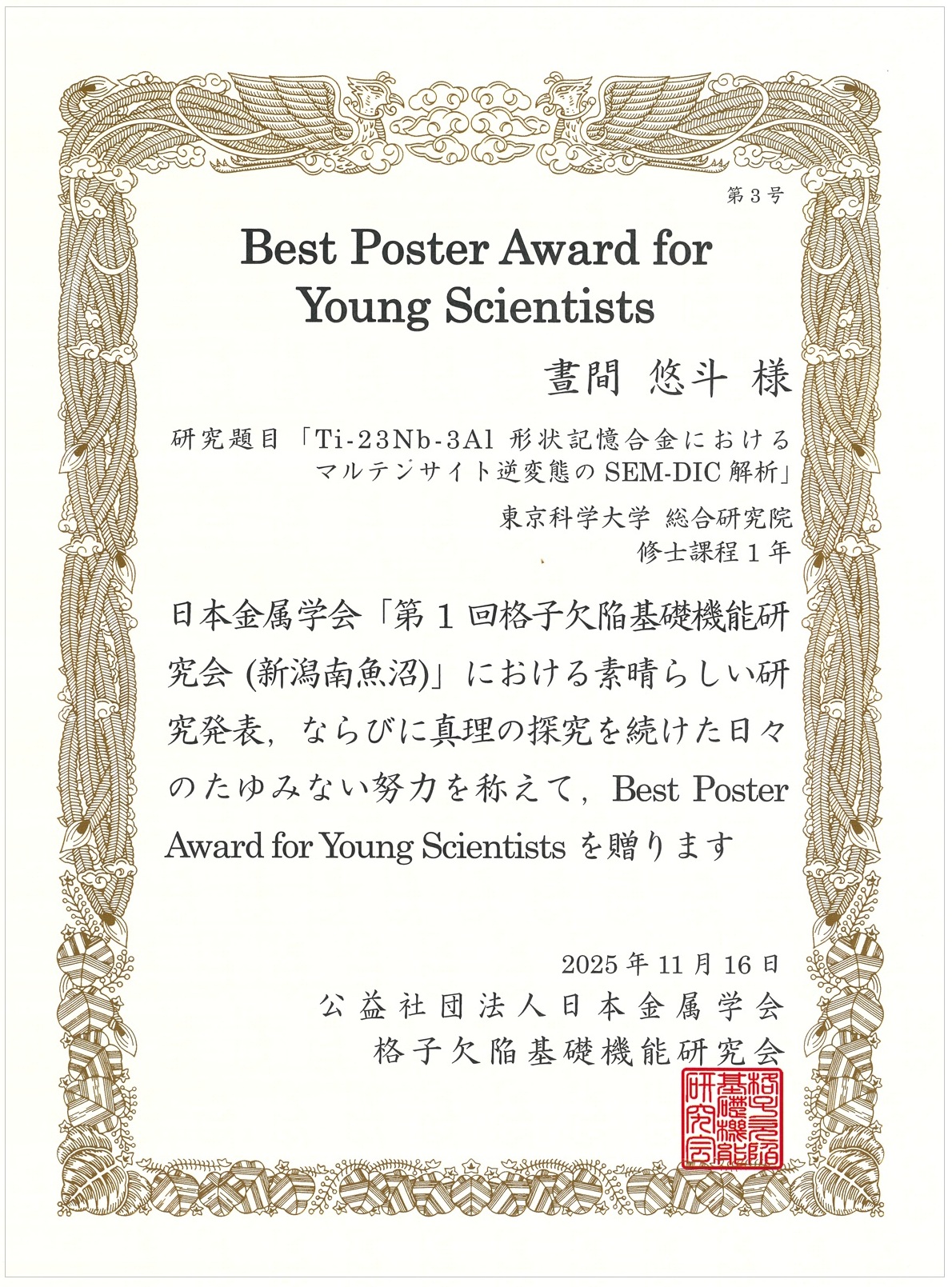 第1回格子欠陥基礎機能研究会「Best Poster Award for Young Scientists」を受賞(細田・田原研究室 晝間悠斗さん)