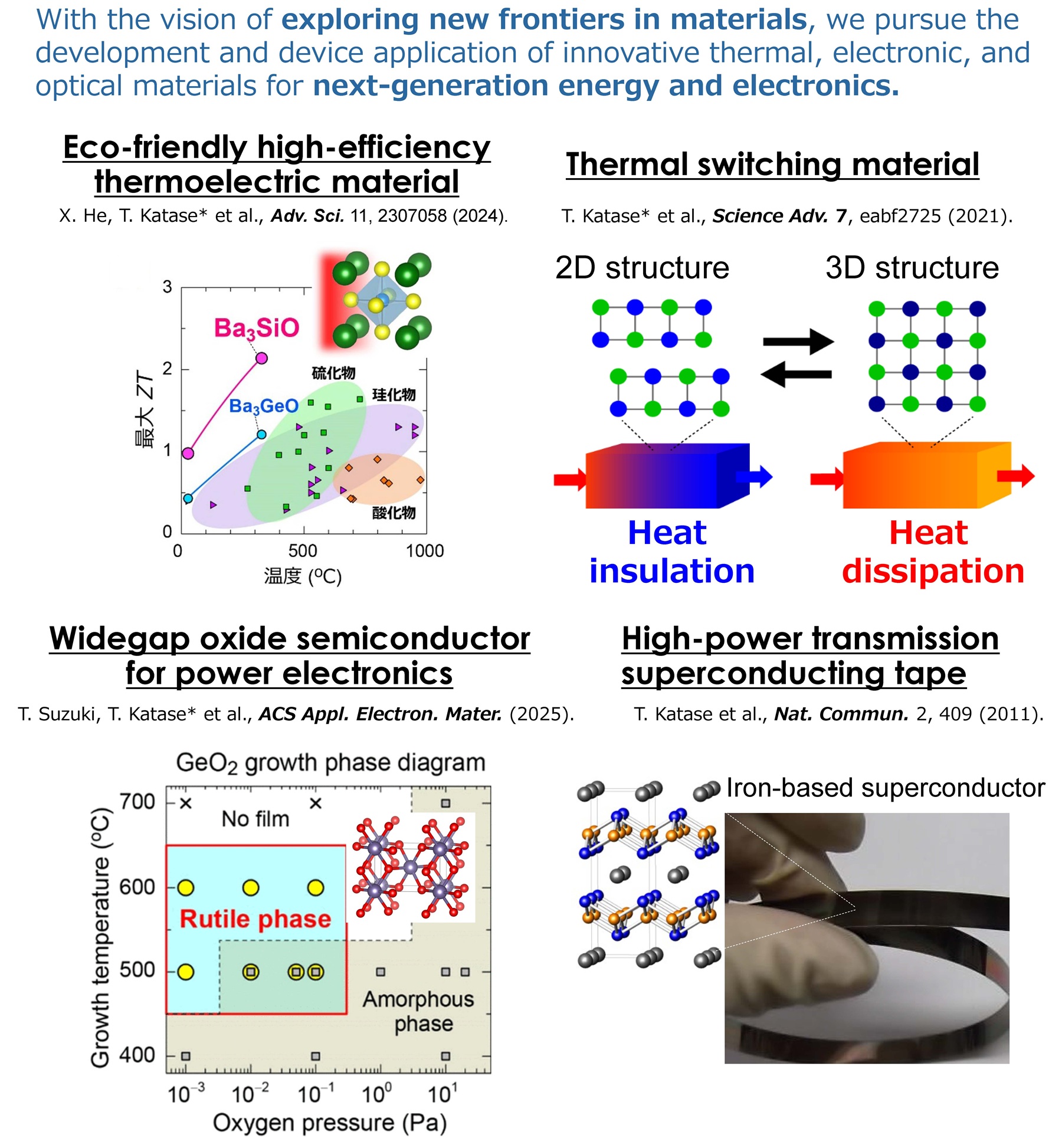 | Keyword | Thermoelectrics, Thermal Engineering, Photoelectric conversion, Optical sensor, Light emitting material, Phase change memory, Power electronics, Oxide electronics, Superconductivity, New material development, Thin film interface |