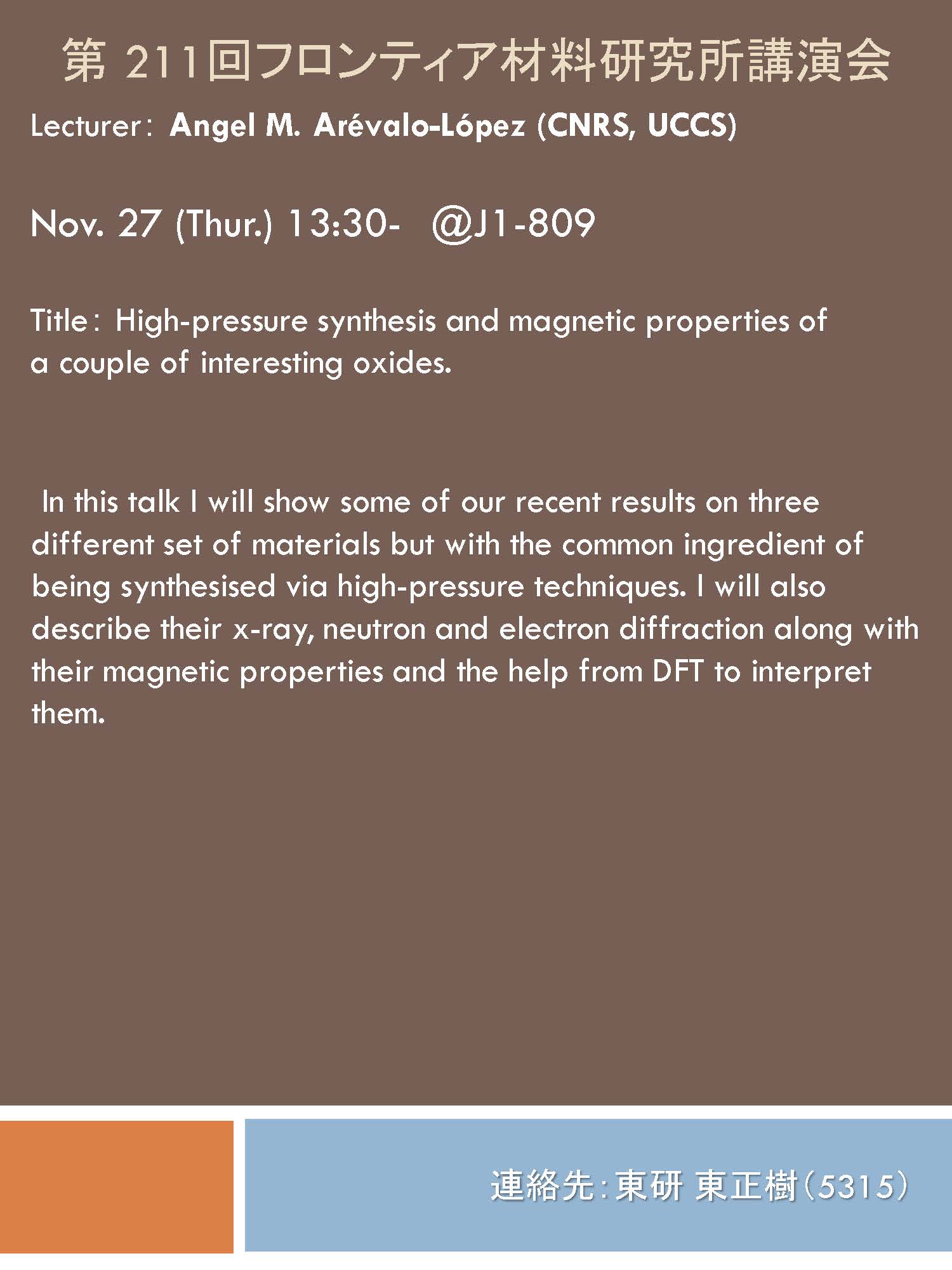 211th MSL Lecture “High-pressure synthesis and magnetic properties of a couple of interesting oxides”(2025/11/27)